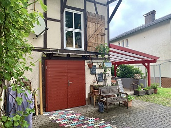 Saisoneröffnung 2026 voraussichtlich im Mai! Die Scheune hat ein neues Tor und der Außenbereich daneben hat ein festes und sonnengeschütztes Dach erhalten. Dieser kann bei Bedarf durch einen mobilen Pavillon ergänzt werden.